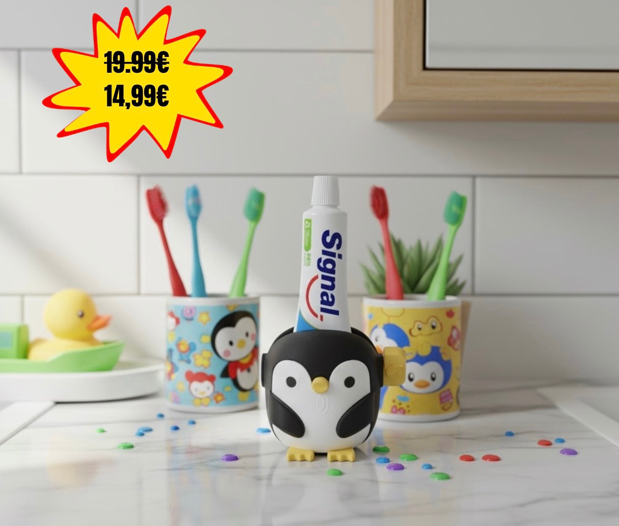 Un petit pingouin beaucoup trop mignon, mais redoutablement efficace, qui presse, écrase et récupère 100 % de ton dentifrice